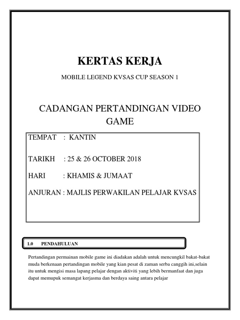 Pertandingan ini dirancang bagi mengeratkan hubungan di antara guru-guru dan. KERTAS KERJA E-SPORT GAME IPG KAMPUS RAJA MELEWAR TAHUN 2019 TARIKH. Saya share kertas kerja yg dibuat oleh pengerusi MGK En Subhi dan penyelaras Bowling En Fadzil.